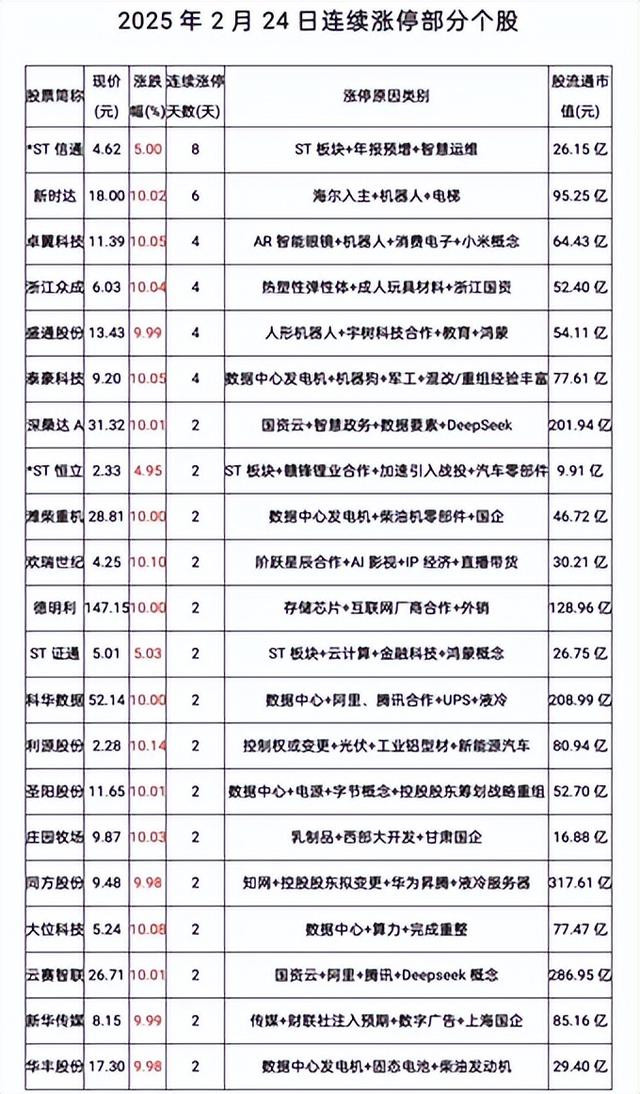【2连板】 深桑达A、潍柴重机、欢瑞世纪、德明利、科华数据、利源股份、圣阳股份、庄园牧场、同方股份、大位科技、云赛智联、新华传媒、华丰股份。